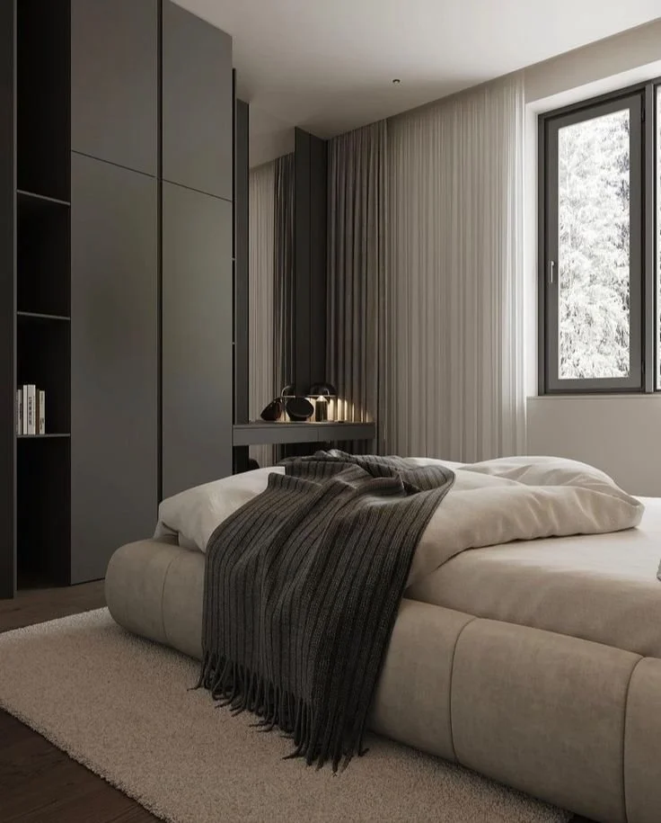 Paleta cromática neutra: Tonos grises y beige predominan, proporcionando una atmósfera cálida y relajante que invita al descanso.