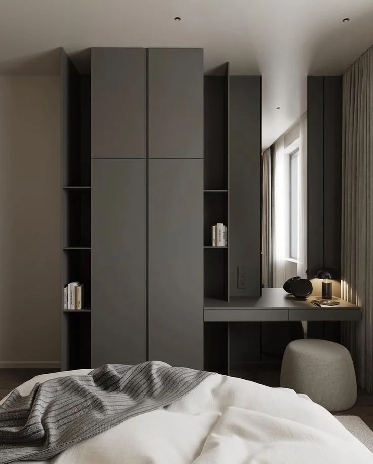 Almacenamiento funcional: Armarios empotrados con acabados mate y estanterías abiertas ofrecen soluciones prácticas, manteniendo la estética ordenada y limpia.