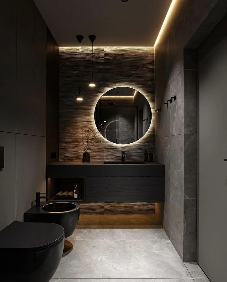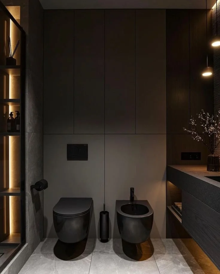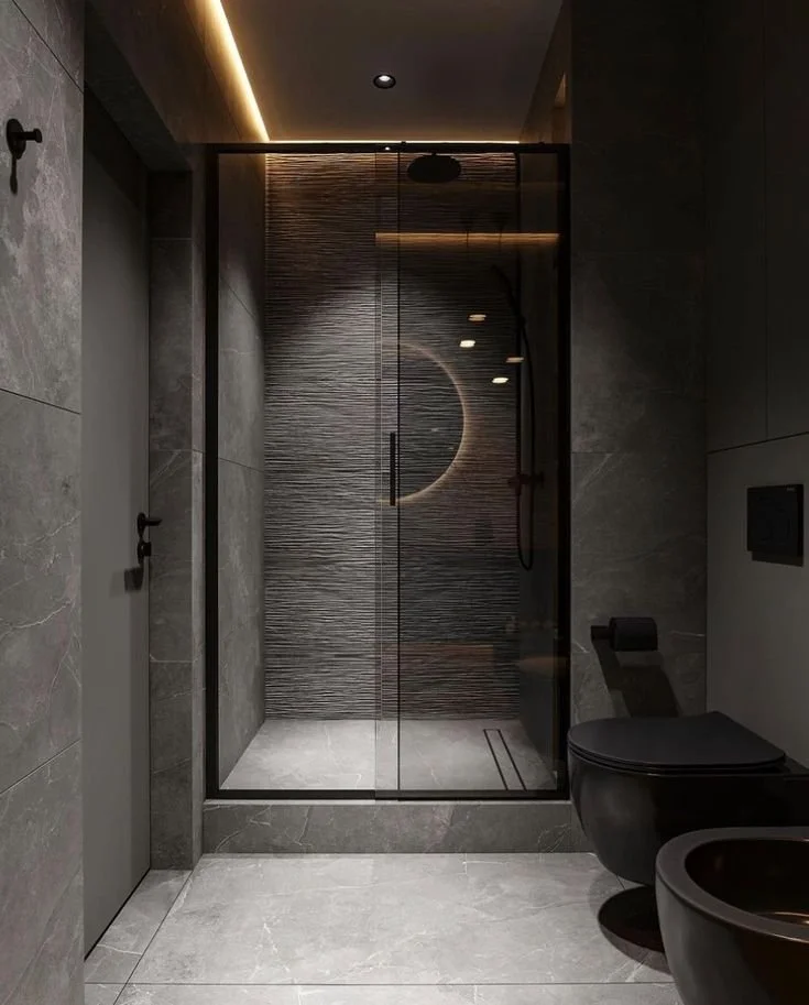 Este baño de diseño minimalista combina líneas limpias y tonos oscuros para crear un ambiente de lujo y relajación.